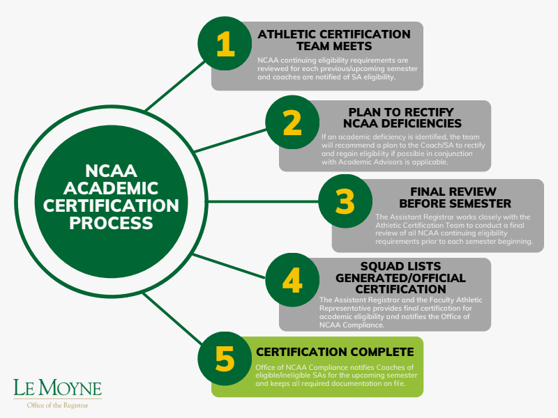 In alignment with NCAA D1 best practices, the Le Moyne College Registrar’s Office serves as the critical decision-making authority for all academic processes and interpretations for 350+ student-athletes. The office is responsible for obtaining, evaluating, and documenting the academic credentials in accordance with National Collegiate Athletic Association (NCAA) and Northeast Conference (NEC) academic eligibility rules.