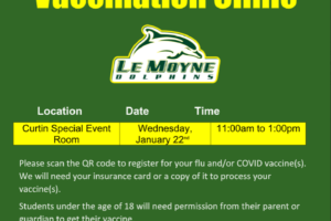 The final vaccine clinic of the flu season will be held on Wednesday, Jan. 22 from 11 a.m. to 1 p.m. in the Curtin Special Events Room. Both COVID and flu vaccines will be offered. The QR code on the attached poster will allow students, faculty and staff to sign up ahead of time, or you can sign up at the link below. As always, walk-ins are welcome and please bring your insurance card.