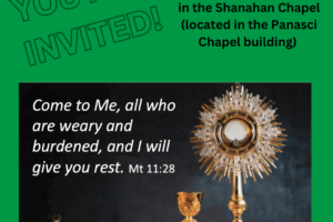 Eucharistic Adoration is an opportunity to spend a quiet, peaceful hour in the presence of Jesus. Every Thursday at 8 pm in the Shanahan Chapel, Eucharistic Adoration is available. All are welcome.