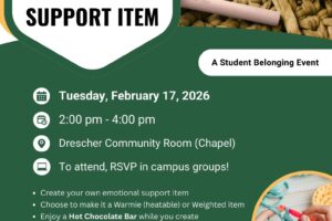 Take a break, get creative, and connect with other students in a welcoming space. What’s Happening • Create your own emotional support item for support on the go • Choose to make it a Warmie (heatable) or Weighted item • Enjoy a Hot Chocolate Bar while you create Why Attend • De-stress and recharge • Meet new people and feel connected • Leave with something cozy and supportive Ev...