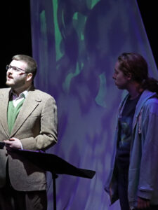 “It’s been a great experience! The cast and crew are wonderful, and we’ve all put in a lot of work to get everything ready in three weeks.” Katie Rotondi Thanks to The Dolphin for the interviews with the cast and crew. Directed by Greg Giovanini, with Chloe Budziszewski as assistant director, starring senior Carly Nicolai, senior Chloe Budziszewski, and freshman Maxwell Martineck. The designers for this production include Professor Ola Kraszpulska, who designed the set and props, and both Mia Leslie-Fox and Jeremy Terino on costume design.