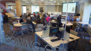 You can find us on the first floor of the Noreen Reale Falcone Library – just go to the right when you enter.